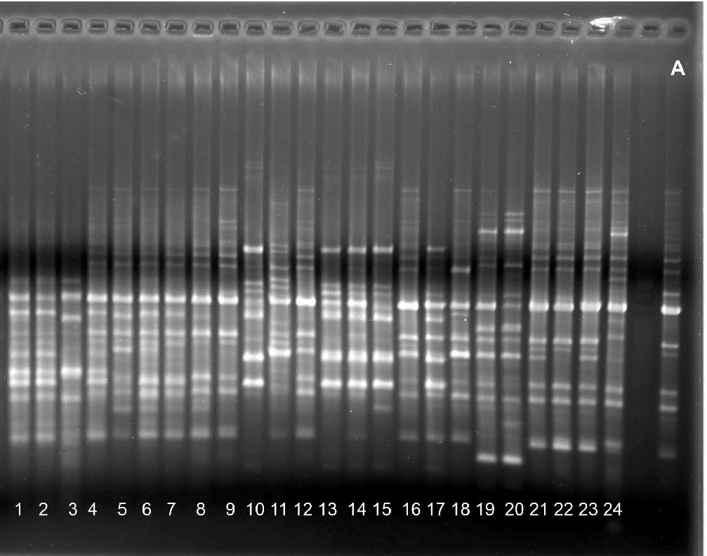 Рис. 2. Фореграмма RAPD-профилей изолятов ризобий, полученных из клубеньков фасоли обыкновенной, инокулированной бактериями после 30-дневной инкубации с корневыми выделениями проростков с использованием праймера AFK-1. А – профиль исходного штамма Pvu2.