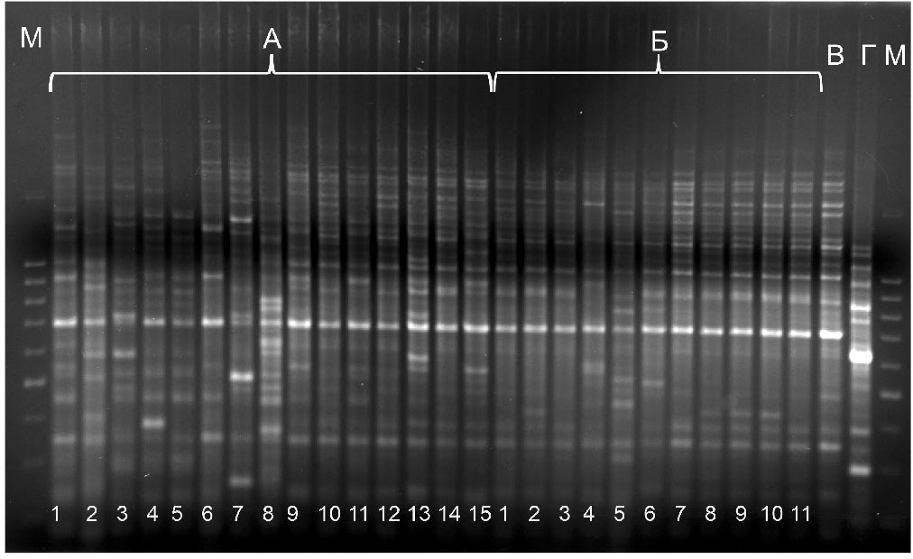 Рис. 1. Фореграмма RAPD-профилей изолятов ризобий, полученных из клубеньков фасоли обыкновенной, с использованием праймера AFK-1: А ‒ профили изолятов, выделенных из клубеньков растения, выращенного на почве, инокулированной штаммами R. leguminosarum Pvu2 и St4 после 30-дневной инкубации; Б ‒ профили изолятов, полученных из клубеньков растения, выращенного на стерильном песке сразу после инокуляции штаммами R. leguminosarum Pvu2 и St4; В – профиль штамма Pvu2; Г – профиль штамма St4; М – 100 п.н. маркер.