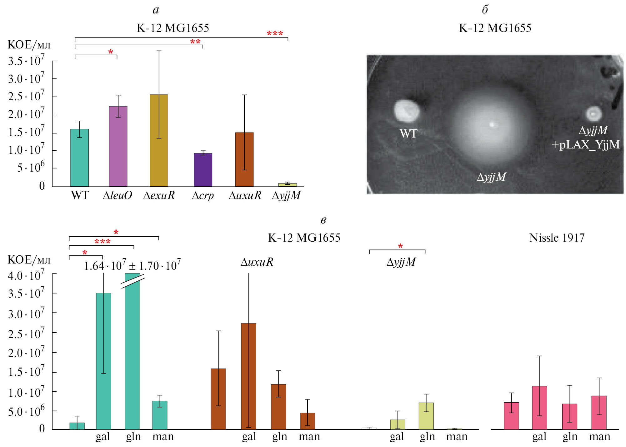 Таким образом, YjjM ингибирует подвижность и активирует способность клеток E. coli K-12 MG1655 к адгезии, а также, наряду с UxuR, необходим для активации адгезии в присутствии гексуронатов. При этом прикрепление к клеткам эпителия кишечника пробиотического штамма Nissle 1917 не зависело от присутствия в среде гексуронатов (рис. 1в).