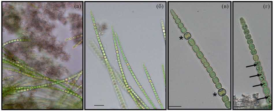 Рис. 1. Трихомы “Anabaena” sp. IPPAS B-2020 в световом микроскопе: а ‒ общий вид трихомов, окруженных окрашенным экзополисахаридным матрикосом; б, в ‒ трихомы с интеркалярными гетероцистами и закругленными коническими концевыми клетками; трихом с клетками, содержащими газовые вакуоли, и развивающейся гетероцистой; зрелые гетероцисты отмечены звездочками; г ‒ стрелки указывают на газовые вакуоли. Масштабная линейка: а, б – 10 мкм; в, г – 20 мкм.