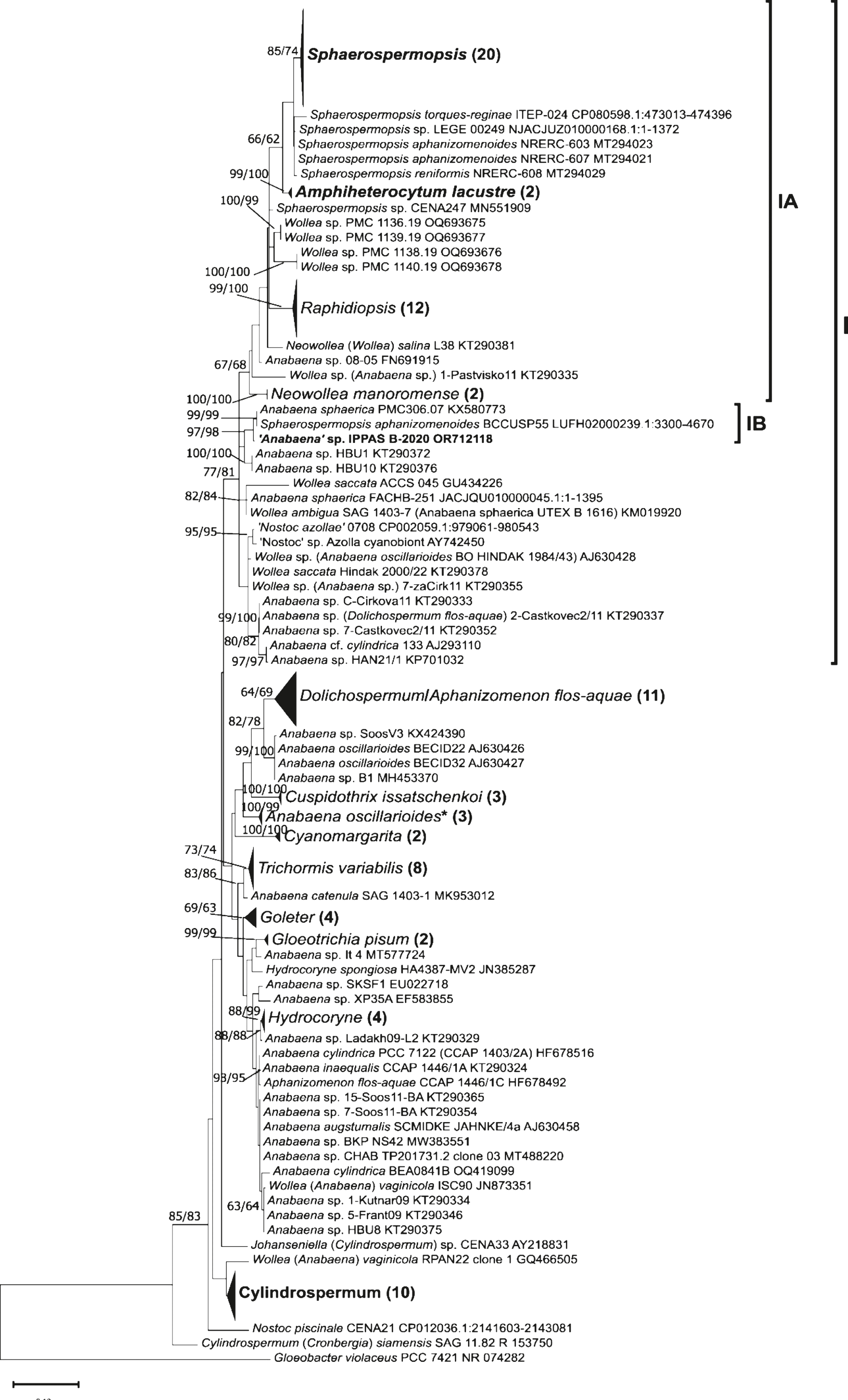 Хотя клада IB не образует кластера с высокой бутсреп-поддержкой ни с какими другими штаммами клады I, она имеет довольно высокое (>98%) сходство со штаммами Anabaena sp. HBU1, Anabaena sp. HBU10, Anabaena sphaerica FACHB-251 и Wollea ambigua SAG 1403-7, а также пограничные значения сходства 97.9‒98.1% со штаммами Wollea saccata Hindak 2000/22 и Wollea sp. 7-zaCirk11. Учитывая это высокое сходство, нельзя исключать отнесение клады IB к роду Wollea, но для решения этого вопроса необходимо прежде всего определить границы этого рода. Против такого объединения говорит тот факт, что штаммы клады IB не образуют макроколонии, но важность этого признака как морфологического маркера уже вызывала сомнения (Kozlíková-Zapomělová et al., 2016).