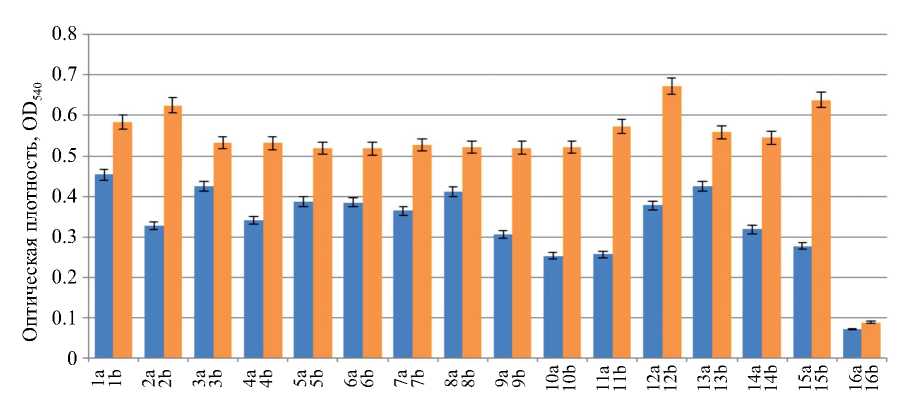 Рис. 1. Формирование биопленок при температуре 37°C бактериями рода Listeria, циркулирующими в мясной промышленности: a – 24 ч инкубирования, b – 72 ч инкубирования; 1 – Listeria monocytogenes (L1), 2 – L. welshimeri (L2), 3 – L. monocytogenes (L3), 4 – L. monocytogenes (L4), 5 – L. monocytogenes (L5), 6 – L. monocytogenes (L6), 7 – L. monocytogenes (L7), 8 – L. monocytogenes (L8), 9 – L. monocytogenes (L9), 10 – L. monocytogenes (L10), 11 – L. welshimeri (L11), 12 – L. monocytogenes (L12), 13 – L. monocytogenes (L13), 14 – L. monocytogenes (L14), 15 – L. innocua (L15), 16 – контроль.
