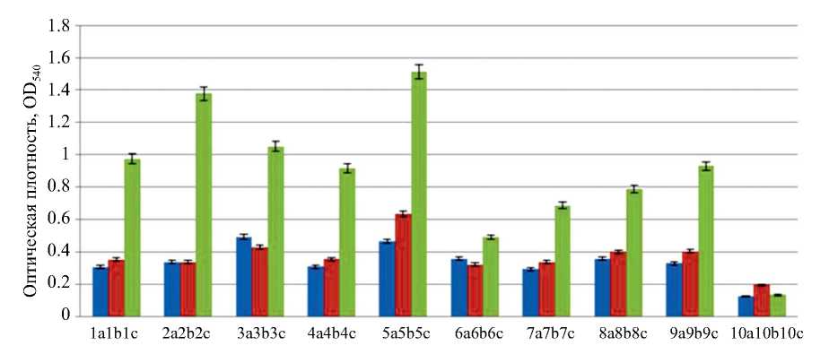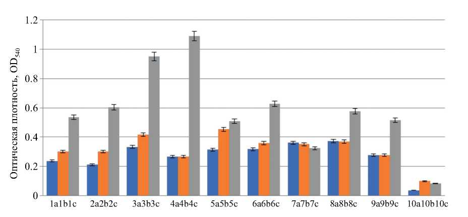 Рис. 2. Формирование биопленок при температуре 37°C бактериями рода Salmonella, циркулирующими в мясной промышленности: а – 24 ч инкубирования, b – 48 ч инкубирования, с – 96 ч инкубирования; 1 – Salmonella sp. (S3), 2 – Salmonella sp. (S10), 3 – Salmonella sp. (S12), 4 – Salmonella sp. (S17), 5 – Salmonella sp. (S22), 6 – Salmonella sp. (S24), 7 – Salmonella sp. (S30), 8 – Salmonella sp. (S31), 9 – Salmonella sp. (S38), 10 – контроль.