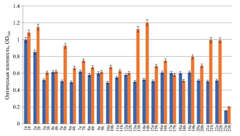 Рис. 5. Формирование биопленок при температуре 4°C бактериями рода Pseudomonas, циркулирующими в мясной промышленности: а – 48 ч инкубирования, b – 72 ч инкубирования; 1 – Pseudomonas gessardii, 2 – P. azotoformans, 3 – P. mandell, 4 – P. marginalis, 5 – P. mendocina, 6 – P. mosselli, 7 – P. orientalis, 8 – P. proteolytica, 9 – P. putida, 10 – P. savastanoi spp, 11 – P. synxantha, 12 – P. tolaasii, 13 – P. aeruginosa, 14 – P. azotoformans, 15 – P. brenneri, 16 – P. fluorescens, 17 – P. fragi, 18 – P. fuscovaginae, 19 – P. gessardii, 20 – P. grimonti, 21 – P. koreensis, 22 – P. libanensis, 23 – контроль.