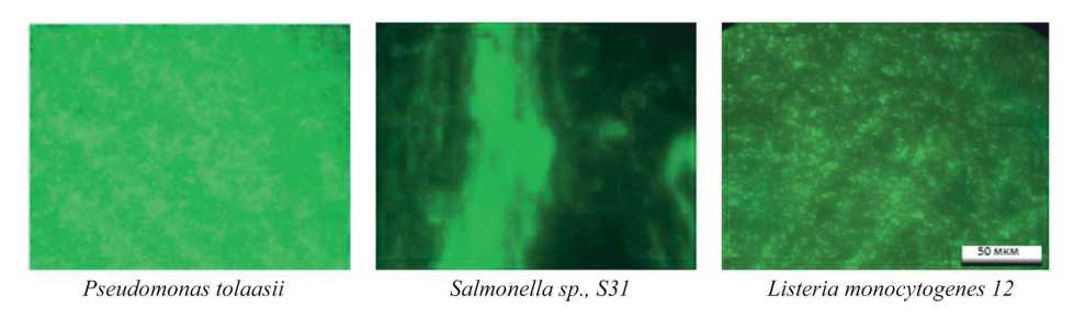 Для подтверждения формирования биопленок были сформированы биопленки при 4°С на стеклянной поверхности с дальнейшим окрашиваем флуоресцентными красителями, позволяющими дифференцировать живые и мертвые клетки. С помощью флуоресцентной микроскопии было подтверждено, что изучаемые микроорганизмы формировали биопленки на стеклянной поверхности (рис. 6).