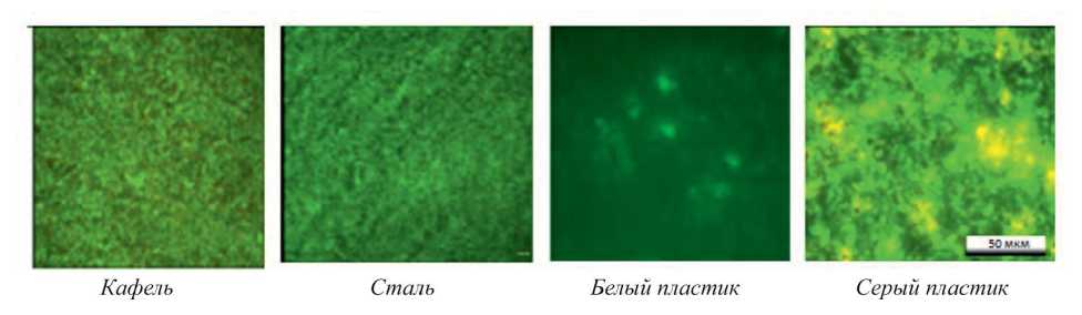 Поскольку биопленки могут присутствовать на абиотических поверхностях пищевых производств, была изучена способность формирования биопленки (на примере патогенной Listeria monocytogenes 12) на материалах, разрешенных для производственной среды предприятий и широко применяемых для изготовления разделочных досок, столешниц, раковин, технологического и вспомогательного оборудования и пр. В качестве таких материалов были выбраны кафель, нержавеющая сталь и два вида пластика (белый и серый). Снимки, полученные с помощью флуоресцентной микроскопии и подтверждающие формирование биопленок, представлены на рис. 7.
