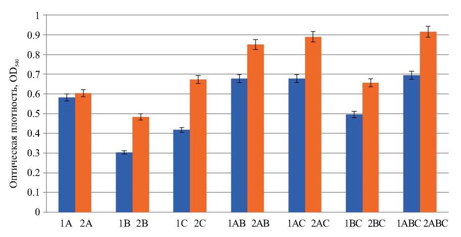 Рис. 8. Синергетические взаимодействия при формировании биопленок трех видов штаммов при температуре 4°C: 1 – 24 ч инкубирования, 2 – 48 ч инкубирования; A – Pseudomonas tolaasii; B – Salmonella sp. (S31); C – Listeria monocytogenes (L12).