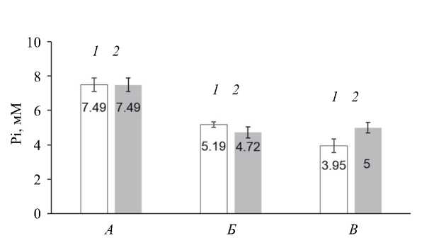 Рис. 3. Концентрация фосфата в среде до культивирования (А) и после культивирования штаммов S. cerevisiae в среде YPD c 2% глюкозой (Б) и YP с 4% этанолом (B): 1 – штамм wt; 2 – штамм Δpho87. Статистическую значимость оценивали относительно данных для штамма wt с помощью t-критерия Стьюдента, используя стандартную программу Excel: В – p < 0.01; A и Б – разница статистически незначима.