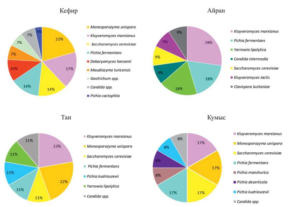 В кисломолочных напитках с высоким содержанием углекислого газа (кефир, кумыс и тан), независимо от использованного для их изготовления вида молока, преобладали дрожжи Monosporozyma unispora, Kluyveromyces marxianus, Saccharomyces cerevisiae и Pichia fermentans (рис. 3). Несмотря на то, что в айране доминирующими видами также были Kluyveromyces marxianus и Pichia fermentans, ни в одном из изученных образцов не были обнаружены дрожжи Monosporozyma unispora.