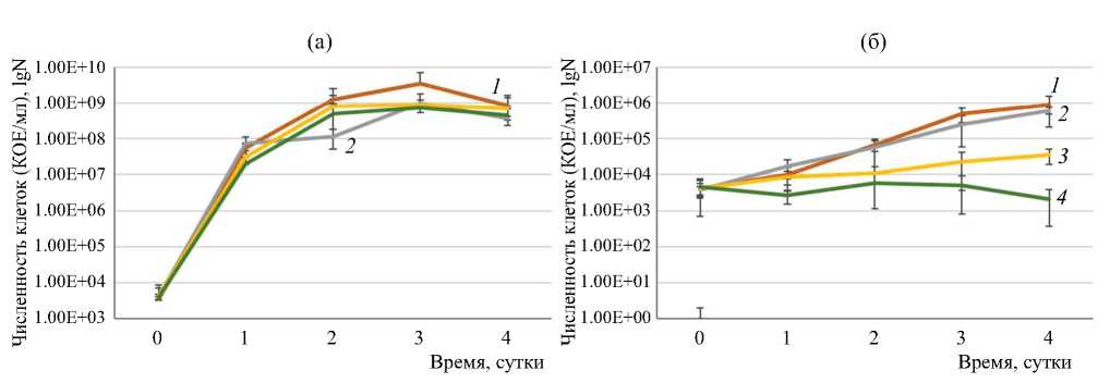 Рис. 2. Динамика численности КОЕ в культурах P. atrosepticum SCRI1043, растущей на питательной среде LB (а), или культивируемой на безуглеродной среде АВ (б) в присутствии разных концентраций СО2: 1 – атм СО2; 2 – 5% СО2; 3 – 10% СО2; 4 – 20% СО2.
