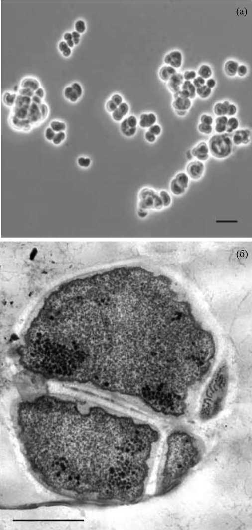 Рис. 2. Морфология клеток штамма Z-7115Т: а ‒ световой микроскоп, фазовый контраст, масштабная метка ‒ 5 мкм; б ‒ электронный микроскоп, масштабная метка – 1 мкм.