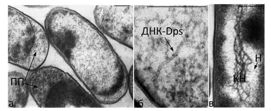 Рис. 3. Тонкие срезы интактных ПФ R. erythropolis (3 мес.): а, б – ПФ I типа; в – ПФ II типа. Видны: компактизованный нуклеоид (а, б); жидкокристаллическая структура ДНК компактизованного нуклеоида изотропного типа (б); мембраноподобные линейные структуры (б); многослойная укладка и петля линейной ДНК-Dps (в). Масштабная метка – 0.2 мкм.