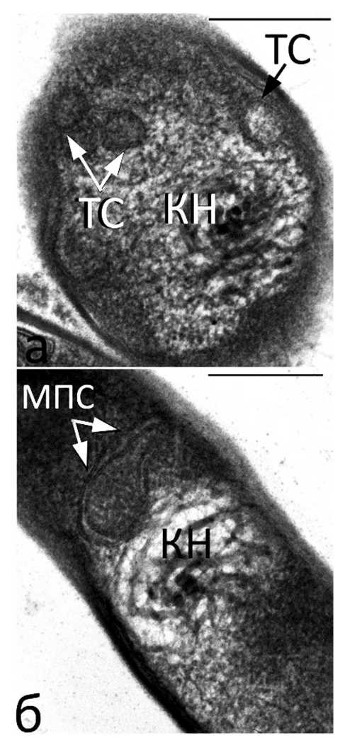 Рис. 11. Тонкие срезы ПФ R. erythropolis, нагретых до 50°C, быстрое охлаждение: а – клетка с достаточно хорошо сохранившимся БН. Видны: жидкокристаллическая ДНК сохранившего структуру компактизованного нуклеоида. Масштабная метка – 0.2 мкм.