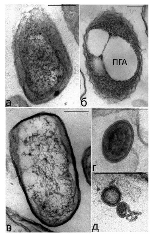 Рис. 1. Тонкие срезы интактных ПФ E. coli (3 мес.): а – ПФ I типа тонкостенная; б – ПФ II типа многослойная. Видны: область компактизованного нуклеоида (а, б, е); многослойная оболочка ПФ II типа (б); ламеллярная укладка ДНК-Dps и/или Dps-Dps (г); тороидальная укладка ДНК-Dps и/или Dps-Dps (в). Масштабная метка – 0.2 мкм.