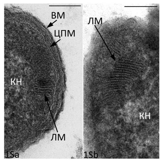 Покоящиеся формы P. extremaustralis (3 мес.) двух морфотипов (I и II), различались толщиной клеточной оболочки (рис. 2а, 2б). Выявляются: области укладки ко-кристаллизованной ДНК-Dps тороидального (рис. 2г; 2Sв) или ламеллярного (рис. 2в; рис. 2Sа‒2Sв); тонко-пакетированная укладка, характерная для Dps-Dps (рис. 2в). Масштабная метка – 0.2 мкм.