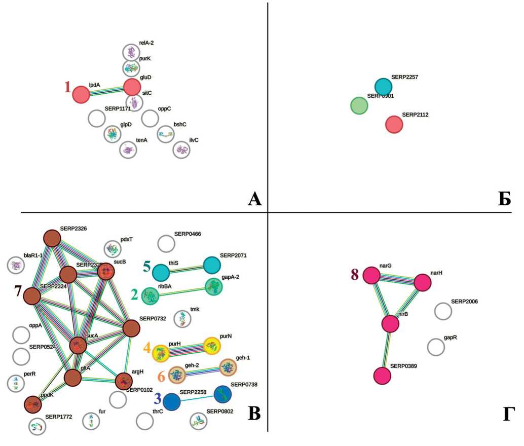 Рис. 4. Изменения белкового состава биопленок S. epidermidis по сравнению с планктонными культурами после 72 ч культивирования. А, Б – контрольные образцы; В, Г – образцы в присутствии CNP. А, В – белки в уменьшенном количестве в биопленках по сравнению с планктонными культурами; Б, Г – белки в увеличенном количестве в биопленках по сравнению с планктонными культурами. 1 – кластер 2-оксоизовалератдегидрогеназы Е3 и глутаматдегидрогеназы; 2 – кластер 3,4-дигидрокси-2-бутанон4-фосфатсинтазы/ГТФ-циклогидролазы II и гуанозин-монофосфатредуктазы; 3 – кластер белков кворум-сенсинга на основе фенол-растворимых модулинов; 4 ‒ синтеза пуринов через фолат; 5 – кластер белков синтеза тиамина; 6 – кластер метаболизма глицеролипидов; 7 – кластер белков ЦТК; 8 – кластер белков метаболизма нитрата.