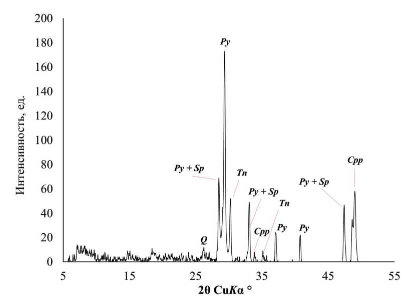Рисунок. Результаты анализа минерального состава концентрата рентгенографическим фазовым методом (дифрактометр ДРОН-2.0 (“Буревестник”, Россия), Cu-Kα); Cpp – халькопирит, Q – кварц, Py – пирит, Sp – сфалерит, Tn – теннантит.