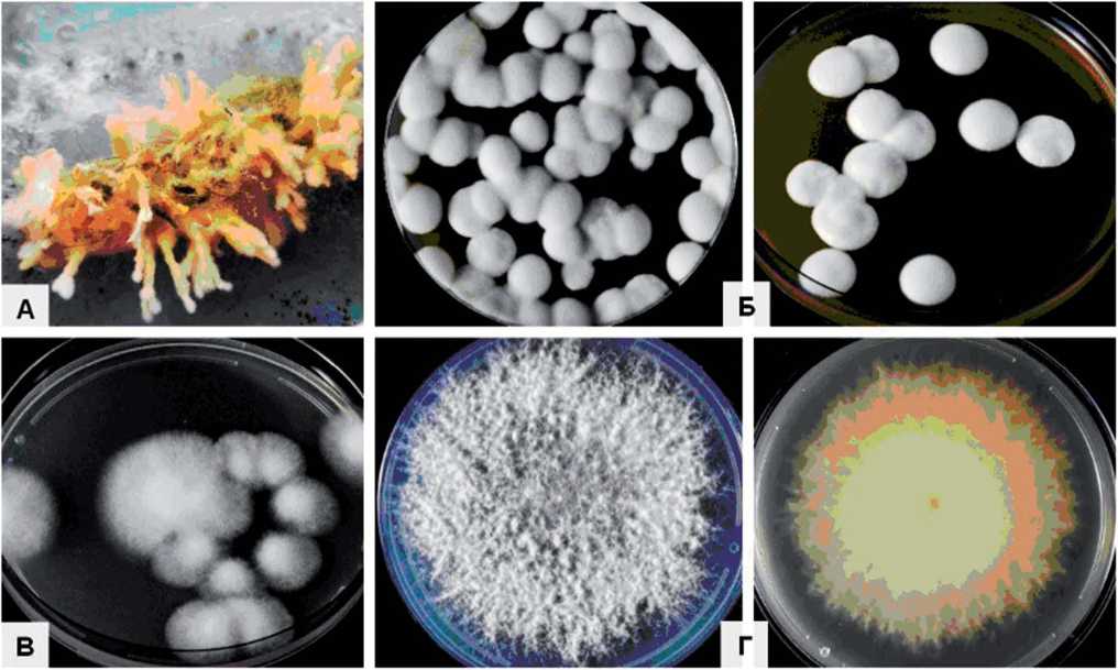 Рис. 1. Морфология колоний C. militaris 11-3: а ‒ мицелий гриба на гусенице Dendrolimus sibiricus; б ‒ колонии на МЭА; в ‒ колонии на КСА (7 сут); г ‒ колонии (слева) и реверс колонии (справа) при старении культуры на КСА (14 сут).