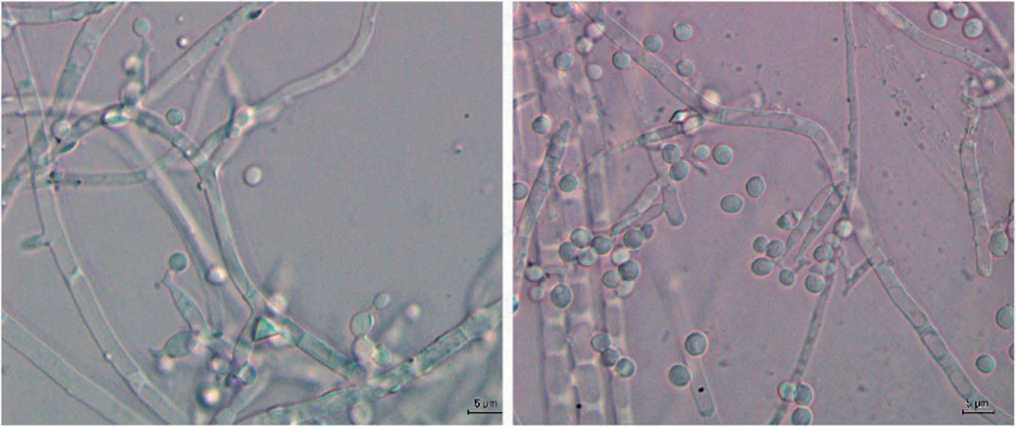Вегетативный мицелий анаморфной формы C. militaris представлен разветвленными, равномерно септированными гифами 1.5‒3 мкм в диаметре, которые в отдельных случаях формировали мицелиальные тяжи. Фиалиды расположены одиночно или пучками на разном уровне, бутылковидной формы с утолщением у основания, размером 10‒30 × 1.5‒2.3 мкм. Верхняя конидия эллиптическая или коротко цилиндрическая размером 3.2‒6.0 × 3.0 мкм, другие шаровидные диаметром 2.3‒3.0 мкм (рис. 2).