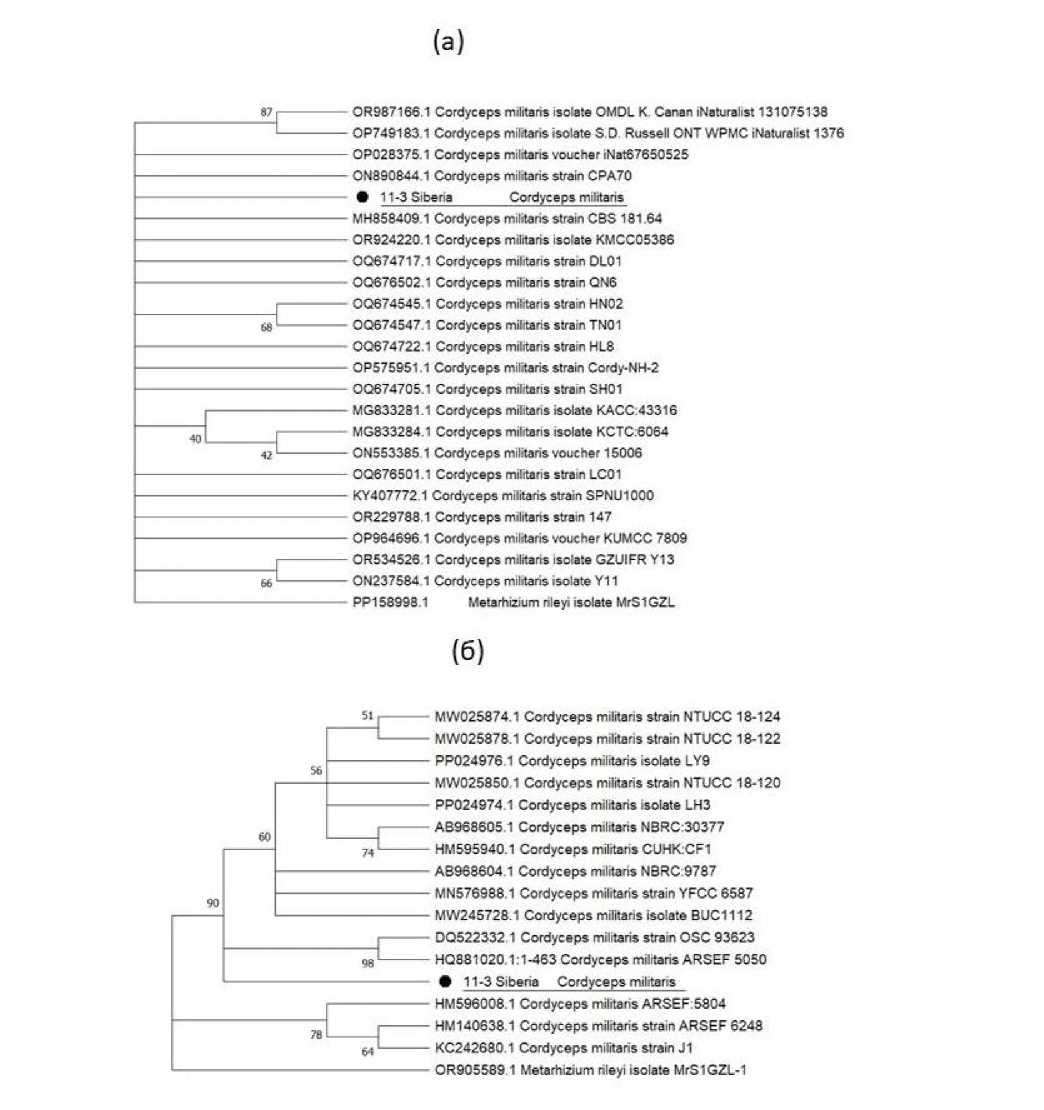 Рис. 3. Филогенетиче ское дерево на основе метода максимального правдоподобия (ML) для штамма 11-3 (Siberia) и последовательностей C. militaris из NCBI GenBank: а ‒ с использованием праймеров ITS (бутстреп-значения более 40% указаны рядом с кластерами); б ‒ с использованием праймеров TEF-1α (бутстреп-значения более 50% указаны рядом с кластерами). В качестве внешней группы использовали Metarhizium rileyi.