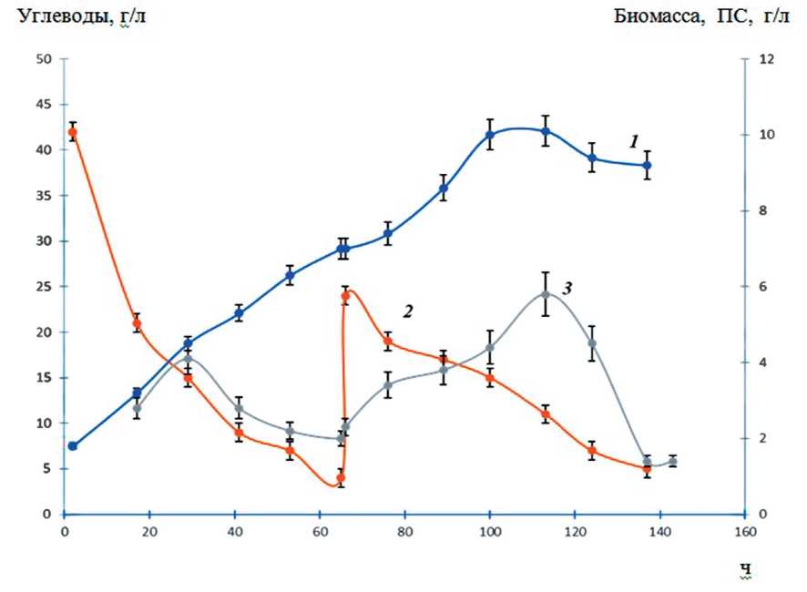 Рис. 5. Динамика роста, синтеза ПС и потребления углеводов C. militaris 11-5: 1 ‒ биомасса, г/л; 2 – углеводы, г/л; 3 – ПС, г/л.