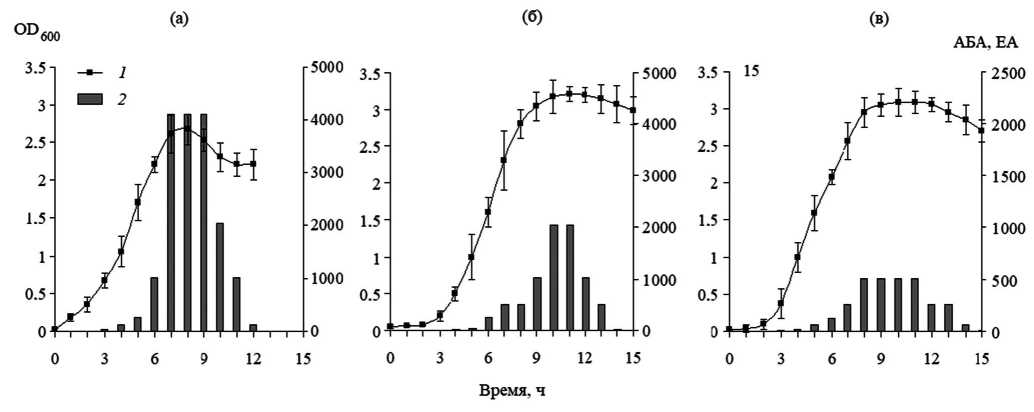 Рис. 2. Кривые роста (1) и антибактериальные активности культуральных жидкостей (2) S. haemolyticus 117 (а), S. hominis ГИСК-284 (б) и S. warneri 1535 (в).