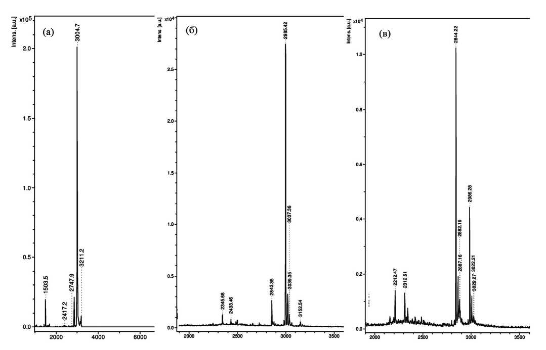 Антибактериальные пептидные соединения бактерий S. haemolyticus 117, S. hominis ГИСК-284 и S. warneri 1535 были получены в очищенном виде методами ионообменной и высокоэффективной обратнофазовой хроматографий. Масс-спектрометрические характеристики полученных антибактериальных соединений свидетельствуют о том, что пептид бактерий S. haemolyticus 117 обладал молекулярной массой 3004 Да, пептид S. hominis ГИСК-284 ‒ 2985 Да, а пептид S. warneri 1535 – 2844 Дa (рис. 3).