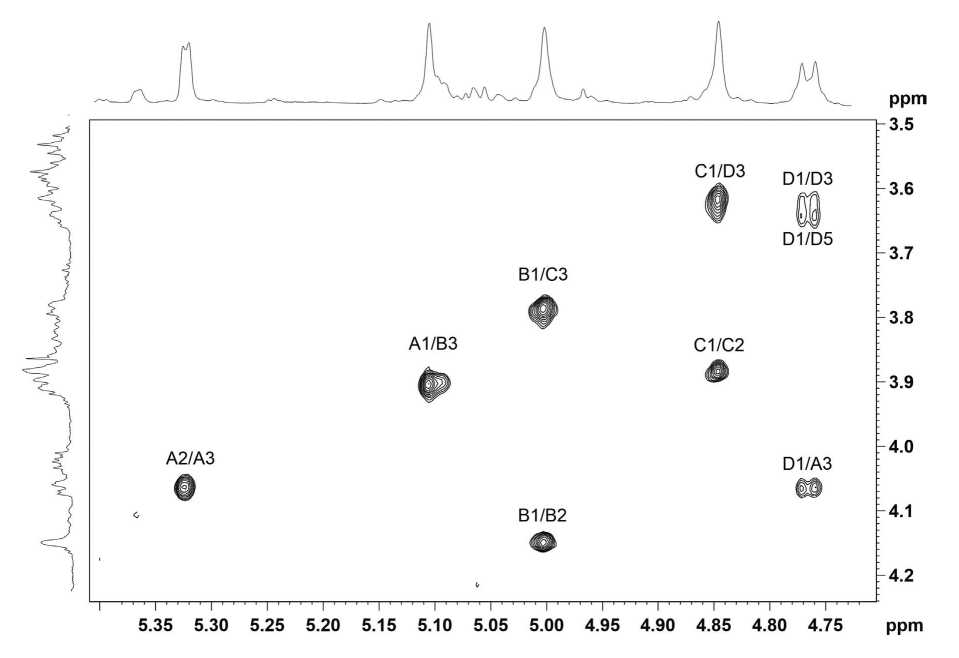 Относительно сильнопольное положение сигналов С-5 остатков A, B и С при δ 70.2-70.4 м.д. и относительно слабопольное положение сигнала С-5 остатка D при δ 74.4 м.д. свидетельствовали об α-конфигурации остатков A, B и С и β-конфигурации остатка D (Bock, Pedersen, 1983). Наличие характеристичных для α-аномеров H-1/H-2 корреляций у остатков A, B и С и характеристичных для β-аномеров H-1/H-3, H-1/H-5 корреляций у остатка D в спектрах 1H, 1H ROESY подтверждало аномерные конфигурации моносахаридных остатков (риc. 3).