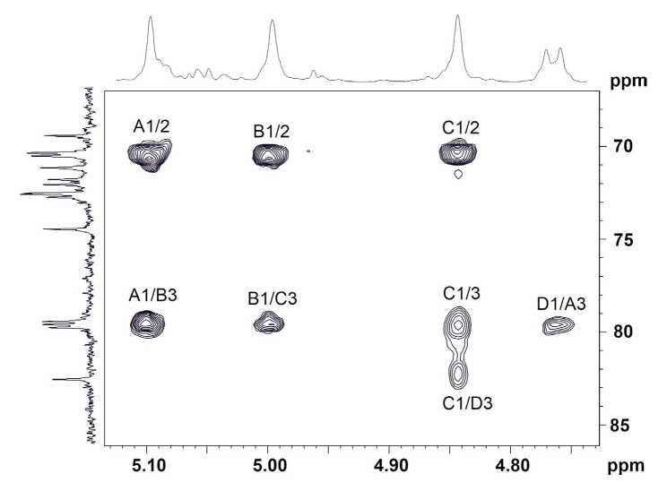 Значительное смещение сигналов С-3 всех моносахаридных остатков, по сравнению с незамещенными моносахаридами (Bock, Pedersen, 1983), указывало на позиции гликозилирования. Последовательность моносахаридов в повторяющемся звене ОПС была определена на основании межзвеньевых корреляций между аномерными протонами и протонами при связьевых углеродах в спектре 1H, 1H ROESY (рис. 3): A H-1/ B H-3 при δ 5.10/3.90 м.д.; B H-1/ C H-3 при δ 5.00/3.78 м.д., C H-1/ D H-3 при δ 4.84/3.62 м.д., D H-1/ A H-3 при δ 4.76/4.06 м.д. В спектре 1 H, 13 C HMBC (рис. 4) ОПС присутствовали соответствующие корреляции между аномерными протонами и трансгликозидными углеродами: A H-1/ B С-3 при δ 5.10/79.7 м.д.; B H-1/ C С-3 при δ 5.00/79.4 м.д., C H-1/ D С-3 при δ 4.84/82.5 м.д., D H-1/ A С-3 a при δ 4.76/79.5 м.д.