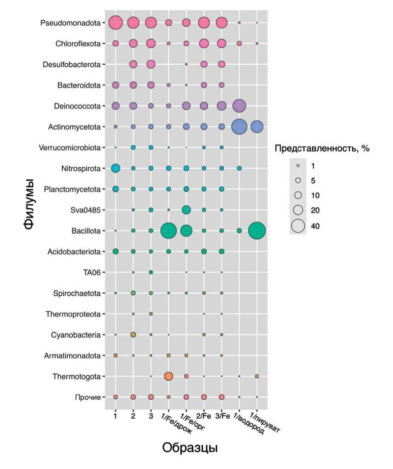 Оценка филогенетического состава была проведена для накопительных культур, с наиболее интенсивным восстановлением ферригидрита (пируват) и с молекулярным водородом, в случае которого было возможно развитие автотрофных диссимиляционных железоредукторов. Результаты профилирования полученных сообществ по гену 16S рРНК выявили существенное сокращение микробного разнообразия в полученных накопительных культурах (рис. 1, 2, табл. S1).