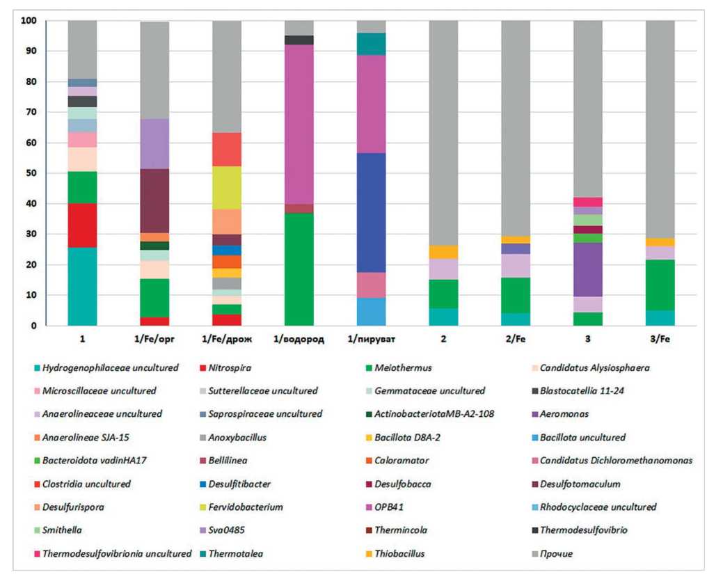 Рис. 2. Таксономическое разнообразие микроорганизмов на уровне родов, ассоциированных с пробами и накопительными культурами Горячинского месторождения подземных вод. Условные обозначения: 1 – проба № 1; 1/Fe/орг – первичная накопительная культура, полученная при добавлении ферригидрита и смеси органических кислот; 1/Fe/дрож – первичная накопительная культура, полученная при добавлении ферригидрита и дрожжевого экстракта; 1/водород ‒ накопительная культура диссимиляционных алкалотермофильных железоредукторов, с водородом как донором электронов; 1/пируват ‒ накопительная культура диссимиляционных алкалотермофильных железоредукторов, с пируватом как донором электронов; 2 – проба № 2; 2/Fe – первичная накопительная культура, полученная при добавлении ферригидрита; 3 – проба № 3; 3/Fe – первичная накопительная культура, полученная при добавлении ферригидрита.