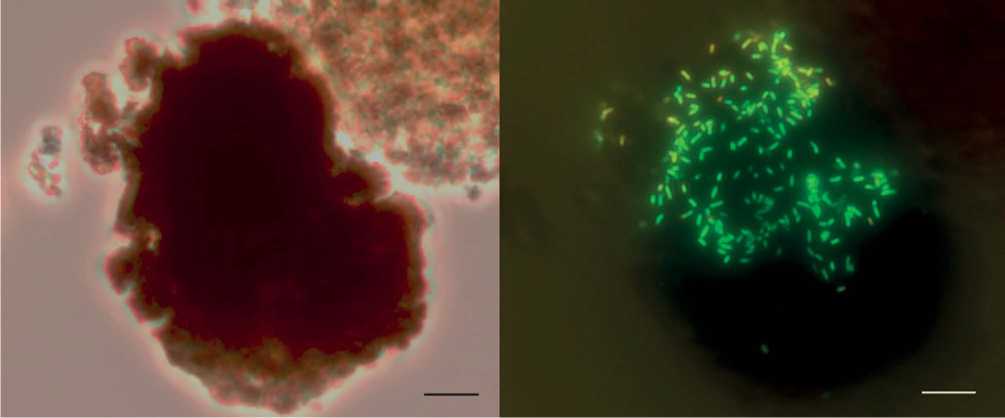 Рис. 3. Микрофотографии алкалотермофильного представителя рода Parvivirga, колонизирующего частицы ферригидрита на среде с молекулярным водородом в качестве донора электронов; а ‒ фазово-контрастная микроскопия; б ‒ флуоресцентная микроскопия того же препарата, окрашенного акридиновым оранжевым. Масштабная линейка ‒ 10 мкм.