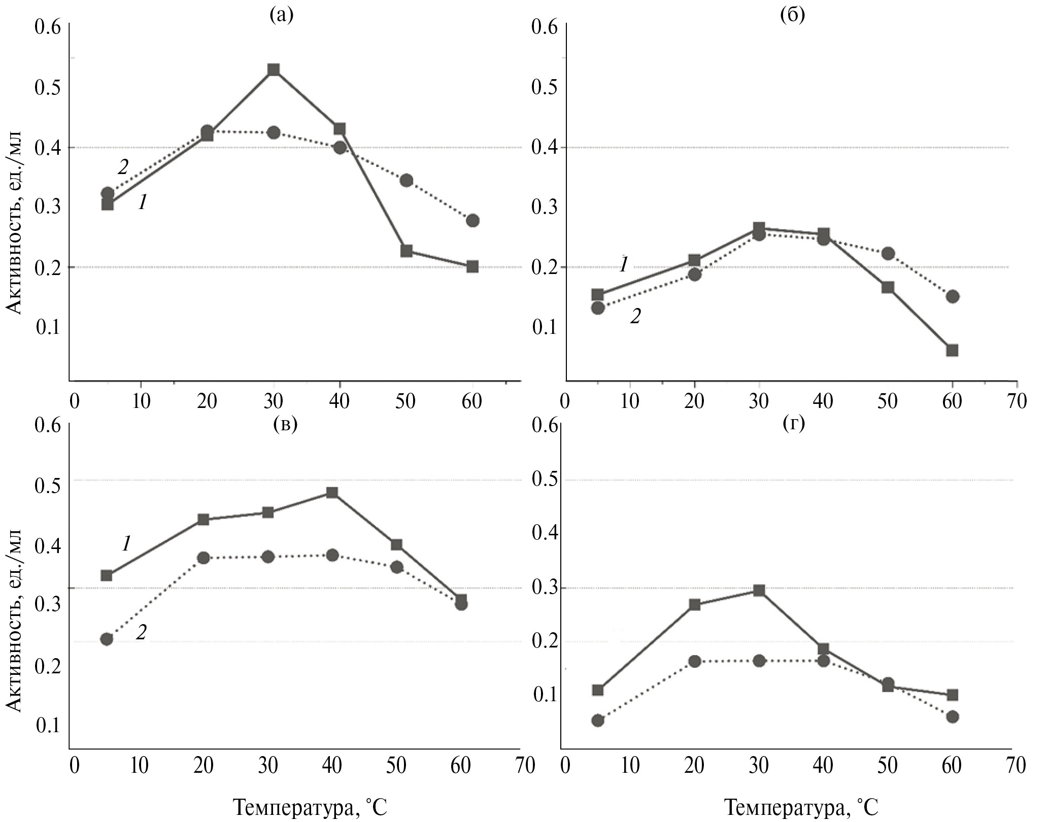 Рис. 3. Температурный оптимум (1) и термостабильность (2) внеклеточных пептидаз выделенных бактерий: а – Н–Н1; б – Н–Н2; в – Н–Н3; г – Н–Н4.