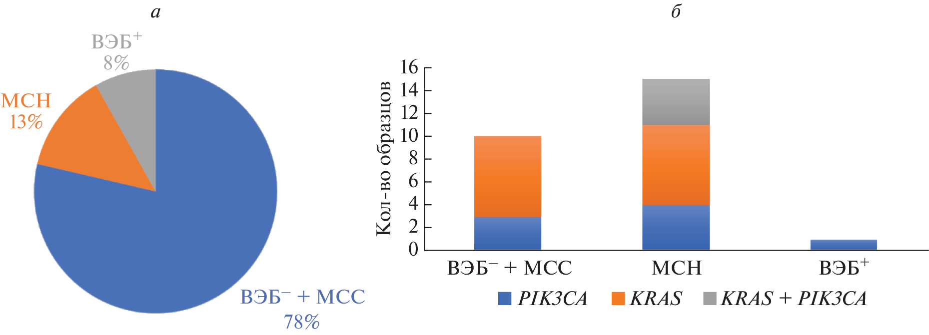 Personalization of gastric cancer treatment is an urgent problem due to clinical heterogeneity and aggressive course of the disease. In 2014, Cancer Genome Atlas researchers divided gastric cancers into four subtypes based on molecular characteristics: Epstein–Barr virus positive (EBV+), microsatellite instability (MSI), chromosomal instability, genomically stable. To date, there is no single method for detecting chromosomal instability and genomically stable subtypes, while MSI analysis and EBV assessment are used in routine practice and are of the greatest clinical importance. We analyzed 159 gastric cancer samples for the presence of MSI, EBV DNA, and somatic mutations in codons 12–13 (exon 2), 61 (exon 3), and 146 (exon 4) of the KRAS gene, codons 597–601 (exon 15) of the BRAF gene and codons 542–546 (exon 9), 1047–1049 (exon 20) of the PIK3CA gene. As a result, the EBV+ gastric cancer was detected in 8.2% of samples, MSI – in 13.2%. MSI and EBV+ were found to be mutually exclusive. The mean age of patients with EBV+ and MSI cancers was 54.8 and 62.1 years, respectively. In 92.3% of EBV+ cancer was detected in men, of which 76.2% were older than 50 years. diffuse and intestinal adenocarcinomas in EBV+ cancer accounted for 6 (46.2%) and 5 (38.5%) cases, respectively. MSI occurred in almost equal proportions in men and women (n = 10; 47.6%, n = 11; 52.4%), with a predominance of intestinal histological type (71.4%) and lesion of the lesser curvature (28.6%). One case of EBV+ cancer was diagnosed with the E545K variant in the PIK3CA gene. A combination of variants in the KRAS and PIK3CA genes was found in all MSI cases. The EBV+ subtype was associated with a better prognosis. Overall five-year survival rates for MSI and EBV+ cancers were 100.0 and 54.7%, respectively.