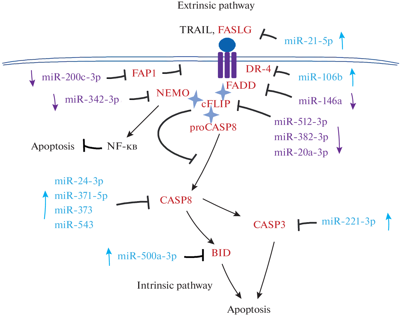 One of the most common malignant liver diseases is hepatocellular carcinoma, which has a high recurrence rate and a low five-year survival rate. It is very heterogeneous both in structure and between patients, which complicates diagnosis, prognosis and response to treatment. In this regard, an individualized, patient-centered approach becomes important, in which the use of mimetics and hsa-miRNA inhibitors involved in the pathogenesis of the disease may be determinative. From this point of view hsa-miRNAs are of interest, their aberrant expression is associated with poor prognosis for patients and is associated with tumor progression due to dysregulation of programmed cell death (apoptosis). However, the effect of hsa-miRNA on tumor development depends not only on its direct effect on expression of genes – primary targets, but also on secondary targets mediated by regulatory pathways. And while the former are actively studied, the role of secondary targets of these hsa-miRNAs in modulating apoptosis is still unclear. The present work summarizes data on hsa-miRNAs whose primary targets are key genes of the extrinsic pathway of apoptosis. Their aberrant expression is associated with early disease relapse and poor patient outcome. For these hsa-miRNAs, using the software package ANDSystem, we reconstructed the regulation of the expression of secondary targets and analyzed their impact on the activity of the extrinsic pathway of apoptosis. The potential effect of hsa-miRNAs mediated by the action on secondary targets is shown to negatively correlate with the number of their primary targets. It is also shown that hsa-miR-373, hsa-miR-106b and hsa-miR-96 have the highest priority as the markers of hepatocellular carcinoma, whose action on the secondary targets enhances their anti-apoptotic effect.