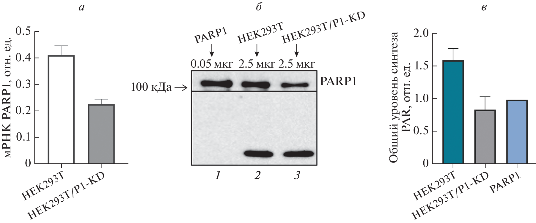 The base excision repair (BER) system is aimed at repair of the largest group of DNA lesions, namely of damaged bases. The main steps in BER are: recognition and removal of the aberrant base, cutting the DNA sugar-phosphate backbone, gap processing (including dNMP insertion), and DNA ligation. The precise functioning of BER depends on the regulation of each step of the process by regulatory/accessory proteins, the most important of which is poly(ADP-ribose)polymerase 1 (PARP1). PARP1 plays an important role in various processes of DNA repair, maintenance of genome integrity, and regulation of mRNA stability and decay. In this regard, PARP1 can affect BER both at the level of proteins involved in the process and at the level of expression of the mRNAs encoding them. There are no systematic data on the effect of various amounts of PARP1 on the activity of key BER proteins and the levels of mRNAs encoding them in human cells. In our work, using whole-cell extracts and RNA preparations obtained from the parental HEK293T cell line and its derivative HEK293T/P1-KD cell line with reduced PARP1 expression (shPARP1-expressing cells, PARP1 knockdown), we assessed the levels of mRNA encoding BER proteins: PARP1, PARP2, uracil DNA glycosylase (UNG2), AP endonuclease 1 (APE1), DNA polymerase β (POLβ), DNA ligase III (LIG3), and XRCC1. In parallel, the catalytic activity of these enzymes was evaluated. No significant effect of the PARP1 amount of on the mRNA levels of UNG2, APE1, POLβ, LIG3, and XRCC1 was found. At the same time, in HEK293T/P1-KD cells, the amount of PARP2 mRNA was reduced by 2 times. The activities of these enzymes in whole-cell extracts of HEK293T and HEK293T/P1-KD cells also did not differ significantly. Under the conditions of poly(ADP-ribose) synthesis, the efficiency of the reactions catalyzed by UNG2, APE1, POLβ, and LIG3 also did not change significantly. In addition, it was shown that a reduced amount of PARP1 in the extract of HEK293T/P1-KD cells does not cause fundamental changes in the nature of DNA PARylation compared to the extract of the parental HEK293T cell line.