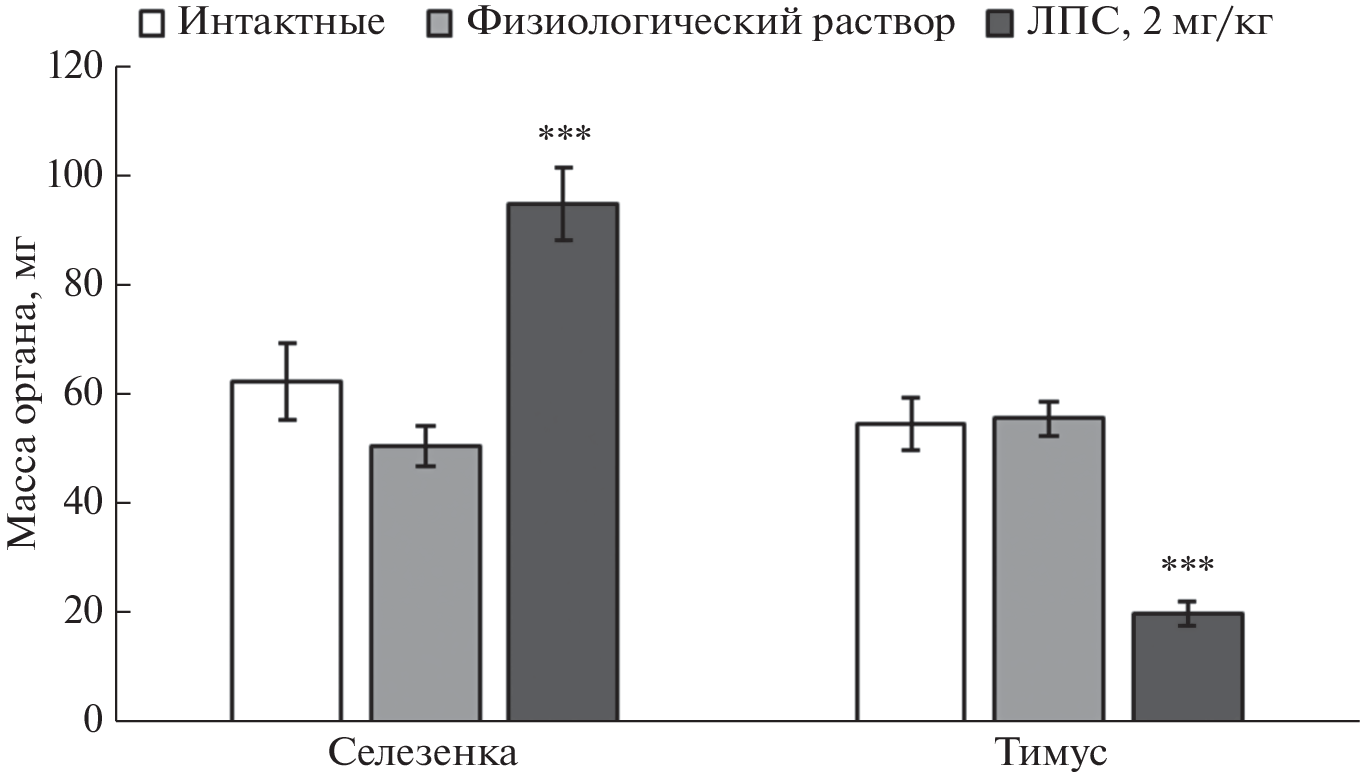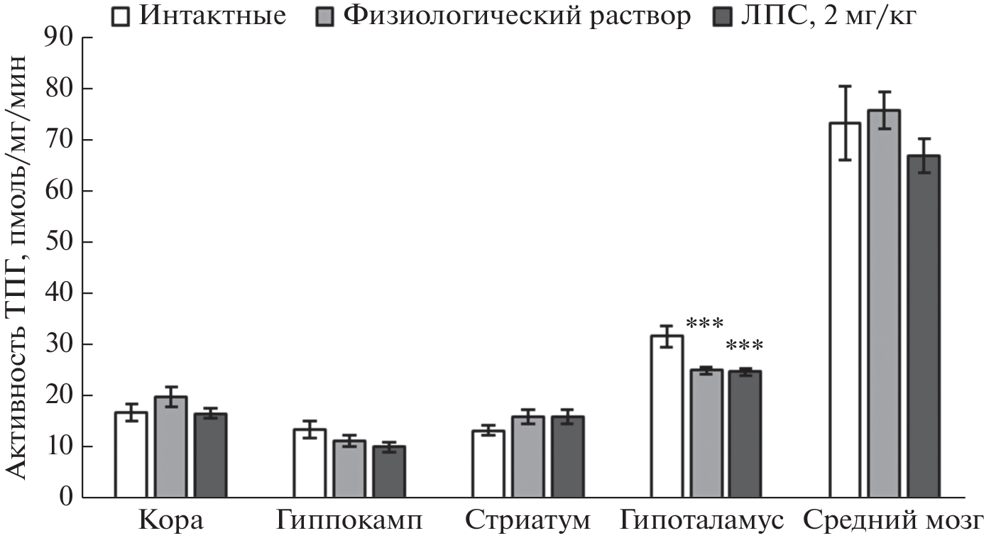 Триптофангидроксилазы 1 и 2 (ТПГ1 и ТПГ2) играют ключевую роль в синтезе гормона и медиатора серотонина (5-HT) в периферических тканях и 5-HT нейронах соответственно. С целью изучения роли ТПГ1 в головном мозге мыши определили уровень мРНК гена Tph1 в разных структурах мозга мышей в норме и при воспалении и сравнили его с уровнем мРНК гена Tph2, с активностью ТПГ и метаболизмом 5-HT. Опыты проводили на трех группах молодых (4 недели) самцов мышей линии C57BL/6 (интактных, контрольных, которым вводили в/б физиологический раствор, и опытных, у которых воспаление моделировали однократным в/б введением липополисахарида (2 мг/кг, ЛПС)). Через 5 суток после введения физиологического раствора или ЛПС определяли маркеры воспаления, массу селезенки и тимуса. В коре головного мозга, гиппокампе, стриатуме, гипоталамусе и среднем мозге с помощью ВЭЖХ оценивали уровень 5-HT и его метаболита – 5-гидроксииндолуксусной кислоты (5-HIAA), активность ТПГ. Уровень мРНК генов Tph1 и Tph2 определяли методом количественной ОТ-ПЦР. Через 5 суток после введения ЛПС наблюдали значительное увеличение массы селезенки и уменьшение массы тимуса. Выявлено значительное увеличение уровня 5-HT и 5-HIAA в среднем мозге и снижение уровня 5-HIAA и активности ТПГ в гипоталамусе мышей, которым вводили физиологический раствор и ЛПС, по сравнению с интактными мышами. Уровень мРНК гена Tph2 была максимальной в среднем мозге, где расположены тела 5-HT нейронов, тогда как в коре, гиппокампе, стриатуме и гипоталамусе уровень мРНК этого гена был в несколько раз ниже. В среднем мозге мышей всех групп уровень мРНК гена Tph1 был в несколько сотен раз ниже, чем уровень мРНК гена Tph2. Таким образом, в мозге мышей ТПГ1 экспрессируется на слишком низком уровне, чтобы существенно влиять на синтез 5-HT в норме и при воспалении.