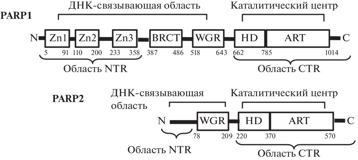 PARP1 and PARP2 proteins are members of the poly(ADP-ribose) polymerase family involved in the regulation of DNA repair and replication, RNA processing, ribosome biogenesis, transcription, and cell division and death. PARP1 and PARP2 are promising targets for the development of anticancer and can be used in treatment of cardiovascular and neurodegenerative diseases, as well as other disorders. WGR domain was shown to play a central role in functioning of PARP1 and PARP2 proteins. This review considers the mechanisms of functioning of WGR domains in PARP1 and PARP2 proteins, which have a number of similar and specialized properties. Understanding these processes is of great interest for fundamental science and will contribute to the development of more effective and selective inhibitors of PARP1 and PARP2.