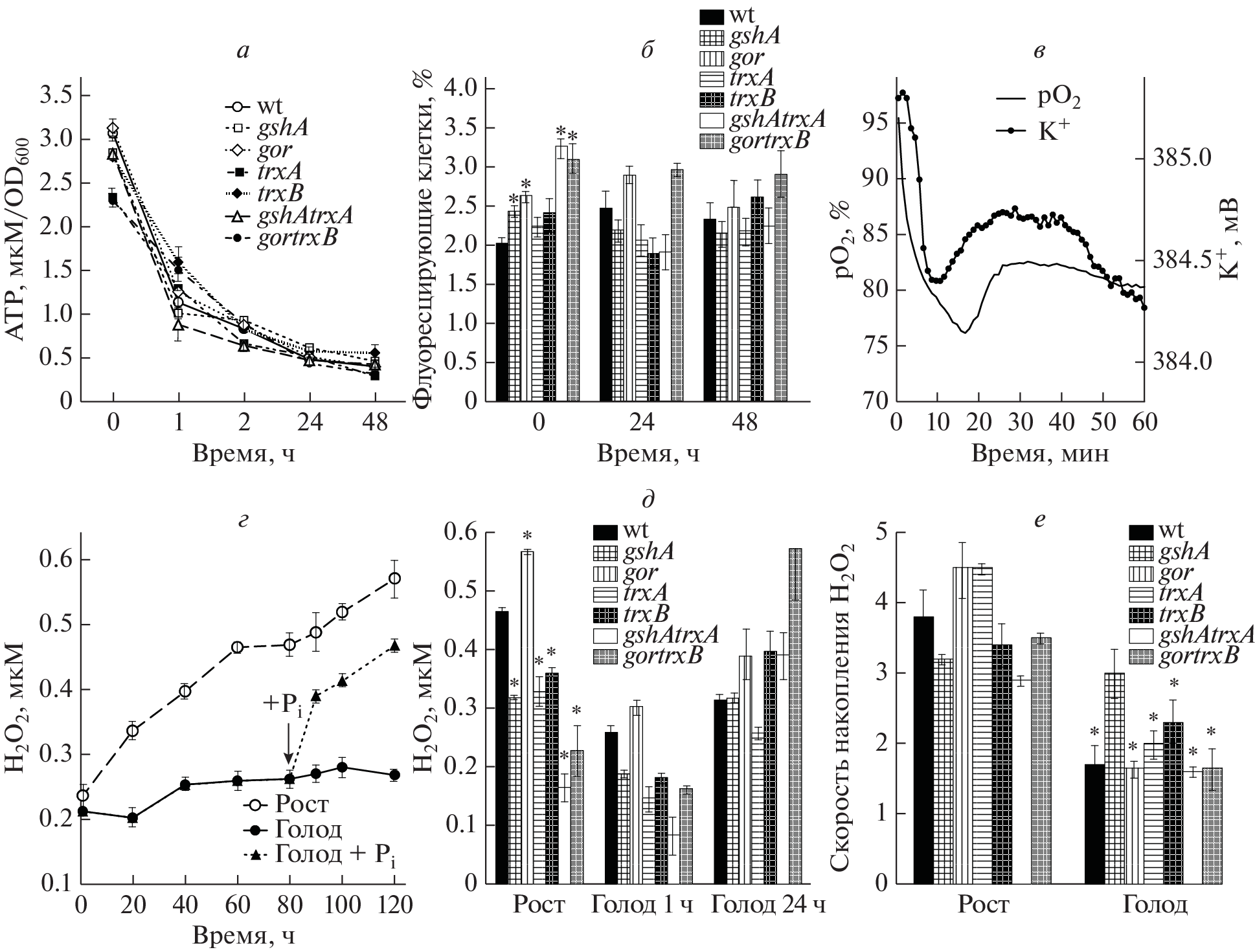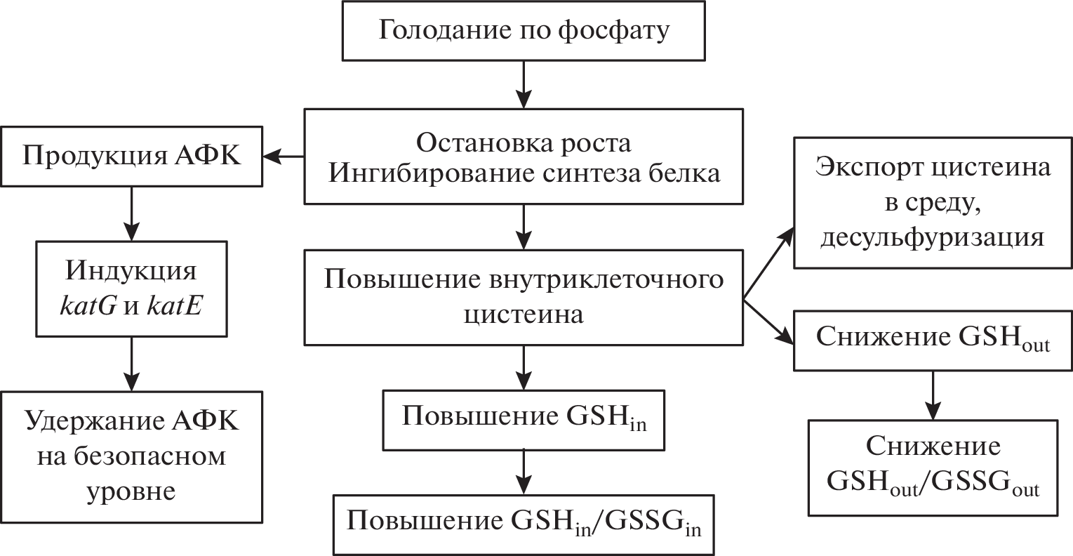 Changes in the activity of antioxidant systems in Escherichia coli during phosphate starvation were studied. It was shown that starvation was accompanied by a decrease in the intensity of respiration, an increase in the rate of superoxide production, and a decrease in the level of ATP. Simultaneously, there was a decrease in H2O2 in the medium and a significant increase in the expression of the katG and katE genes encoding the HPI and HPII catalases, respectively. At the same time, there was no drop in the membrane potential, which may indicate the retention of normal membrane activity in starving cells. It has been shown for the first time that the transition of E. coli to phosphate starvation is accompanied by significant changes in the status of glutathione. The most important of them are associated with a decrease in the level of glutathione reductive form (GSH) in the medium (GSHout) and with a simultaneous increase in its content in the cytoplasm (GSHin), as well as a shift in the GSHin to oxidized glutathione form (GSSGin) ratio towards reductive values, and GSHout/GSSGout towards oxidative values. Among the mutants used in the work, the double mutant gor trxB, deficient in the synthesis of glutathione reductase and thioredoxin reductase, showed the most pronounced distinctive features. Compared to the parental strain, this mutant showed a multiple higher expression of katG::lacZ, the highest level of oxidized intra- and extracellular glutathione, and, accordingly, the lowest GSH/GSSG ratio in both compartments. In general, the data obtained indicate that during phosphate starvation the interaction of the glutathione redox-system and regulons that control protection against reactive oxygen species creates conditions that allow maintaining the concentration of ROS below the toxic level. As a result, phosphate-starved E. coli cells can maintain a high viability for a long time that allows them quickly to resume growth after the addition of phosphate.