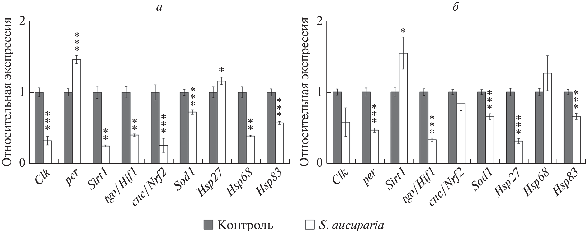 Растительные полифенолы характеризуются широким спектром биологической активности, включая антиоксидантные свойства, и имеют высокий геропротекторный потенциал. Целью работы было исследование влияния экстракта ягод рябины обыкновенной (Sorbus aucuparia L.) на продолжительность жизни и стрессоустойчивость Drosophila melanogaster с выявлением возможных механизмов его биологической активности. Установлено, что этанольный экстракт ягод S. aucuparia, основные компоненты которого рутин и цианидин-3-рутинозид, обладает выраженной антиоксидантной активностью in vitro. Обработка экстрактом ягод рябины увеличивала устойчивость самцов D. melanogaster к голоданию, но снижала устойчивость к гипертермии. У самок экстракт снижал устойчивость к окислительному стрессу, но повышал устойчивость к гипертермии. Эффекты экстракта ягод рябины на продолжительность жизни зависели как от концентрации экстракта, так и от пола дрозофил. В ответ на обработку экстрактом ягод рябины у самцов и самок D. melanogaster обнаружены незначительные различия в фоновом уровне экспрессии генов клеточного ответа на стресс, включая гены теплового шока (Hsp27, Hsp68, Hsp83), устойчивости к окислительному стрессу (tgo/Hif1, cnc/Nrf2, Sod1), циркадных ритмов (Clk, per) и ген долголетия Sirt1, что может объяснять различия в наблюдаемых эффектах.