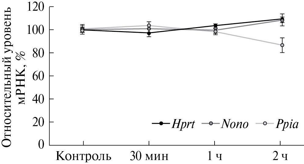 ПЦР-РВ проводили на приборе LightCycler 96 (“Roche Molecular Systems”, США). Реакционная смесь объемом 20 мкл включала 8 мкл 2.5-кратной реакционной смеси для проведения ПЦР-РВ в присутствии красителя SYBR Green I (“Syntol”, Россия), кДНК и праймеры (по 0.15 мкМ каждого). Олигонуклеотидные праймеры подбирали с помощью программы PrimerBLAST (http://www.ncbi.nlm.nih.gov/tools/primer-blast/). Гены и последовательности праймеров, использованных в работе, перечислены в табл. 1. В качестве генов сравнения использовали Nono (non-POU domain containing, octamer-binding), Ppia (peptidylprolyl isomerase A) и Hprt1 (hypoxanthine phosphoribosyltransferase 1). Анализ содержания мРНК этих генов сравнения в гипоталамусе крыс НИСАГ не выявил статистически значимых изменений при воздействии рестрикционного стресса разной продолжительности (рис. 1).