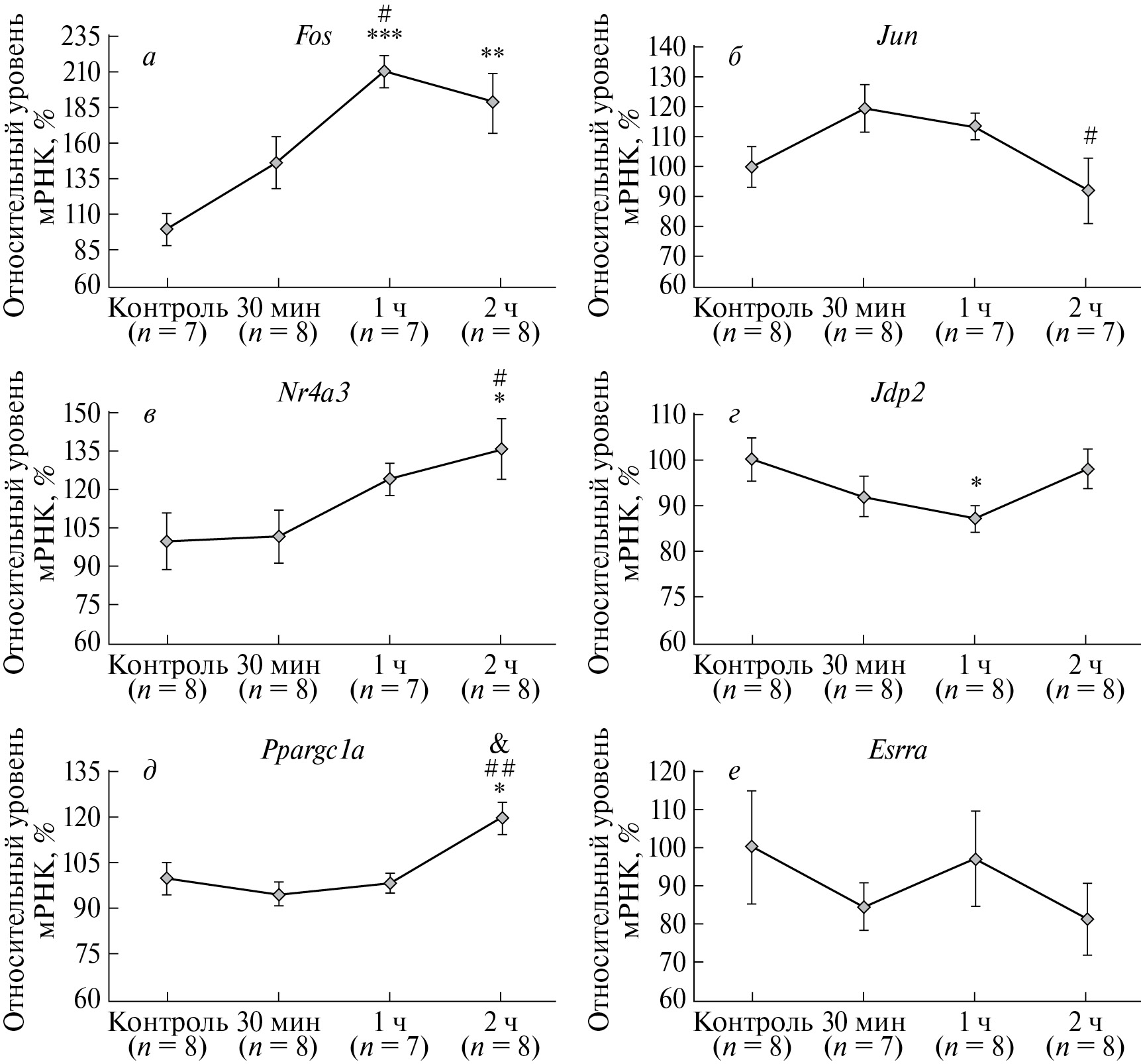 Рис. 3. Динамика стресс-индуцированных изменений содержания мРНК генов раннего ответа в гипоталамусе крыс НИСАГ при воздействии рестрикционного стресса разной продолжительности: Fos (а), Jun (б), Nr4a3 (в), Jdp2 (г), Ppargc1a (д), Esrra (е). *p < 0.05; **p < 0.01 и ***p < 0.001 по сравнению с контролем, #p < 0.05; ##p < 0.01 по сравнению с группой 30-минутного стресса; &p < 0.05 по сравнению с 1-часовым стрессом (Post-hoc, LSD test).