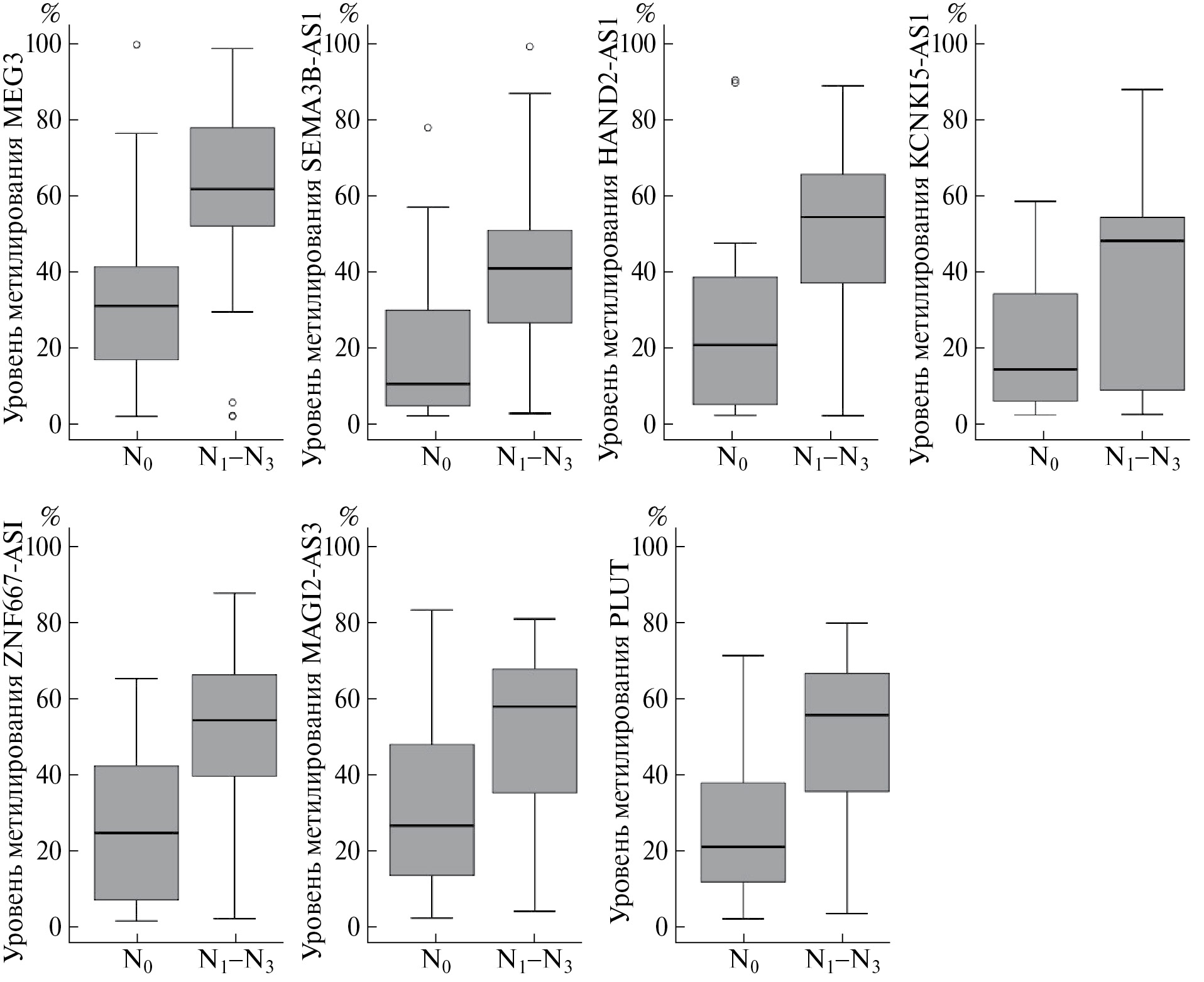 Рис. 3. Уровень метилирования генов днРНК MEG3, SEMA3B-AS1, HAND2-AS1, KCNK15-AS1, ZNF667-AS1, MAGI2-AS3 и PLUT в образцах опухолей молочной железы с метастазами (N1–N3) и без метастазов (N0).
