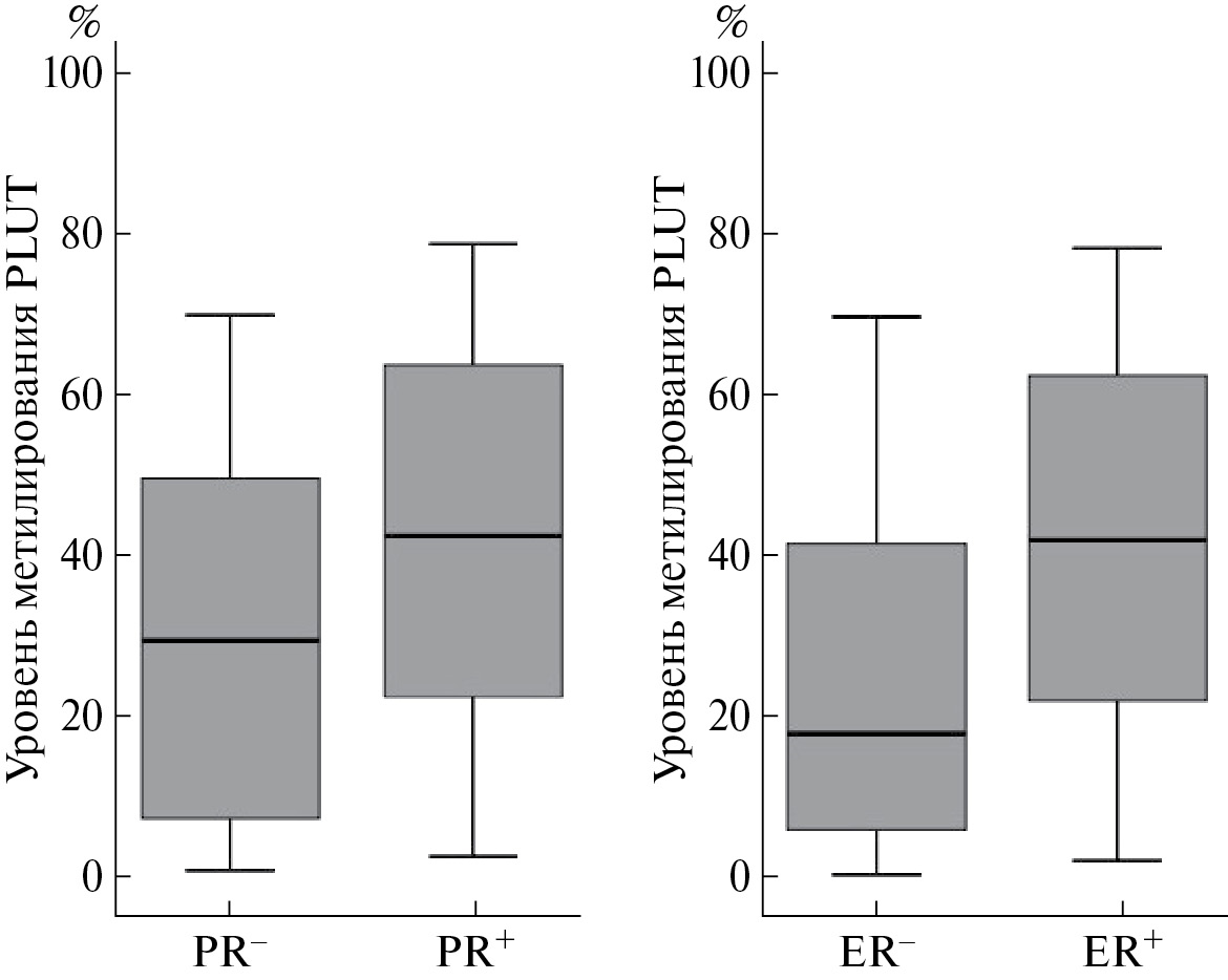 Выявлено статистически значимое (p = 0.04) увеличение уровня метилирования гена днРНК PLUT в опухолях молочной железы, экспрессирующих рецепторы прогестерона и эстрогена (PR+, ER+) (рис. 4).