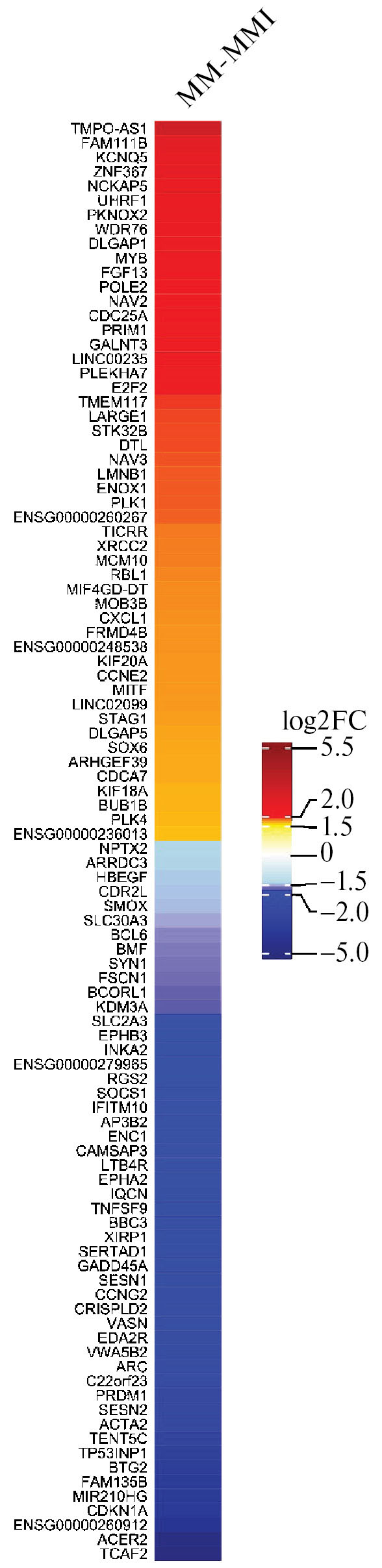 Рис. 1. Тепловая карта изменений экспрессии генов в клетках меланомы под действием ингибитора васкулогенной мимикрии. Отобрано по 50 генов, экспрессия которых максимально изменилась (повысилась либо снизилась) под действием ингибитора. Приведена цветная шкала изменений экспрессии в log2FC. 50 генам, экспрессия которых усилилась, соответствует критерий logFC > 1.71 (т. е., их экспрессия повысилась более чем в 3.27 раза). 50 генам, экспрессия которых снизилась, соответствует критерий log2FC < 1.89 (т. е. экспрессия снизилась более чем в 3.7 раза).
