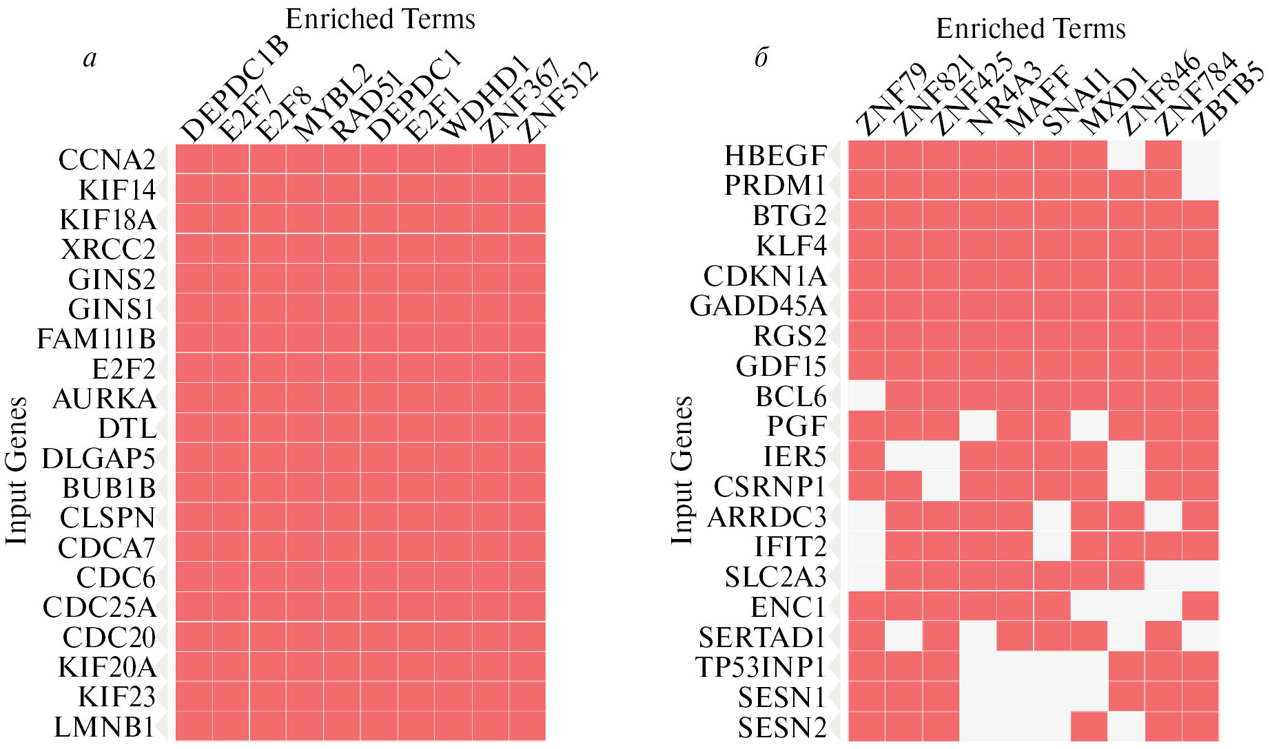 Рис. 2. Гены, экспрессия которых изменилась под воздействием ингибитора (Input Genes), регулируются одновременно многими ФТ (Enriched Terms). а – Гены, экспрессия которых усилилась. б – Гены, экспрессия которых снизилась. Результаты получены с помощью базы данных Enrichr (https://maayanlab.cloud/Enrichr/enrich) для поиска ФТ, одновременно регулирующих гены (Enrichr Submissions TF-Gene Coocurrence).