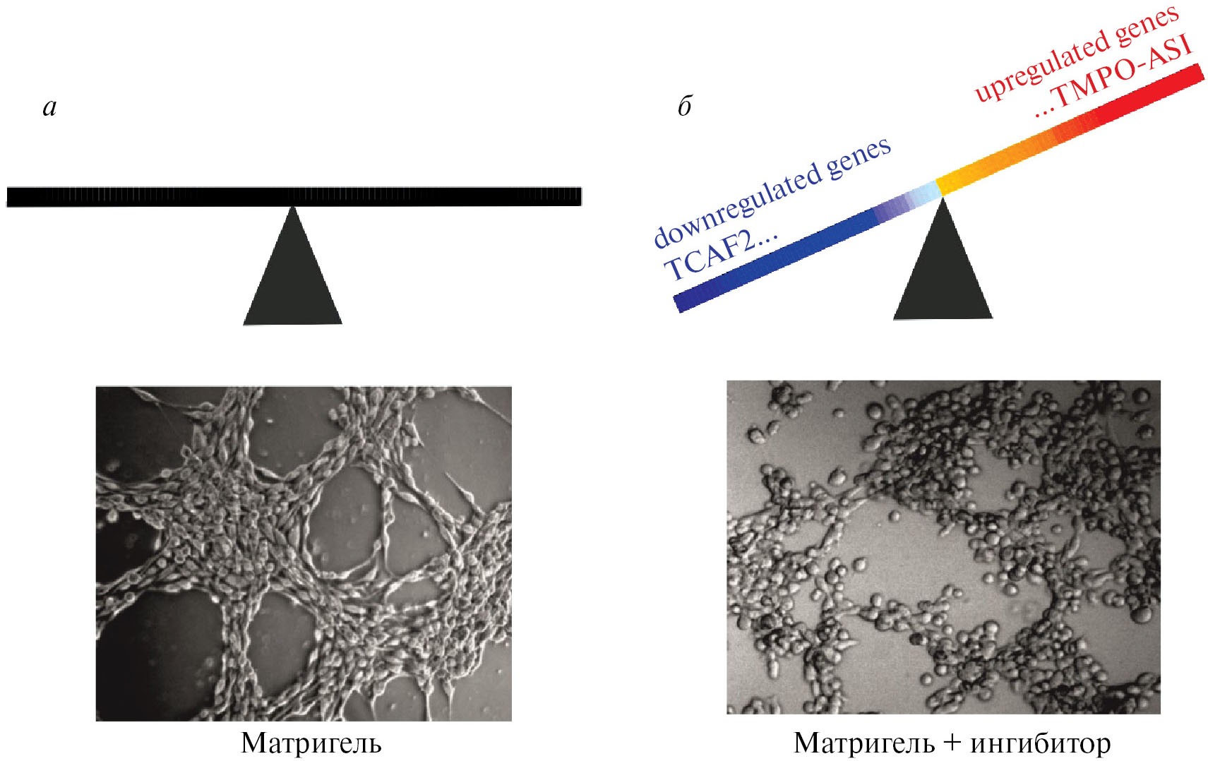 Рис. 3. Схема, показывающая, как добавление ингибитора нарушает баланс генной экспрессии и как это сказывается на фенотипе клеток меланомы. а – Баланс экспрессии генов до добавления ингибитора. Клетки веретеновидной формы на Матригеле формируют сосудоподобные структуры. б – Нарушение баланса экспрессии генов вызывает изменение поведения клеток (нарушается образование сосудоподобных структур) и их формы (клетки более округлые).