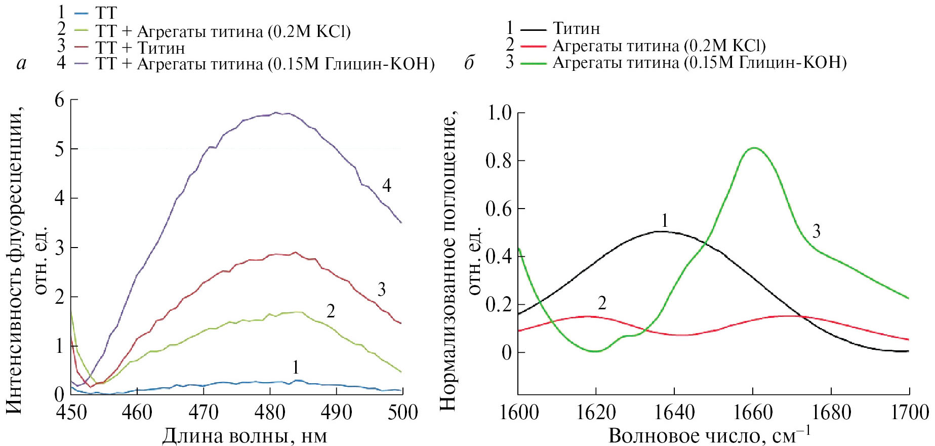 Рис. 3. а – Интенсивность флуоресценции ТТ в присутствии титина и агрегатов этого белка, сформированных в течение 24 ч в растворах, содержащих 0.15 М глицин-КОН, рН 7.0 (4, фиолетовый цвет) и 200 мМ KCl, 10 мM имидазол, pH 7.0 (2, зеленый цвет). Красный цвет (3) – интенсивность флуоресценции ТТ в присутствии молекулярной формы титина; б – ИК-Фурье-спектры титина и его агрегатов при 20 °C. Концентрация белка 36–42 мг/мл. Неагрегированный скелетномышечный титин (1, черный цвет). Агрегаты скелетномышечного титина, сформированные в растворе 200 мМ KCl, 10 мM имидазол, pH 7.0 (2, красный цвет). Агрегаты скелетномышечного титина, сформированные в растворе 0.15 М глицин-КОН, рН 7.0 (3, зеленый цвет).