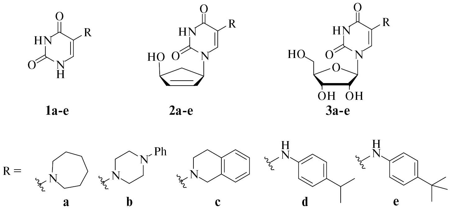 В попытке найти новые аналоги пиримидиновых нуклеозидов, обладающие противоопухолевой активностью, проведен скрининг цитотоксичности производных 5-аминоурацила с различными заместителями (1а–е), а также их 5’-норкабоциклических и рибопроизводных (2а-е и 3а-е соответственно) (рис. 1) в отношении двух линий клеток нейробластомы (SH-SY5Y и IMR-32), лимфобластоидных клеток К-562, промиелобластных клеток HL-60 и низкопассажных вариантов высокодифференцированной мультиформной глиобластомы (GBM5522 и GBM6138) [18].
