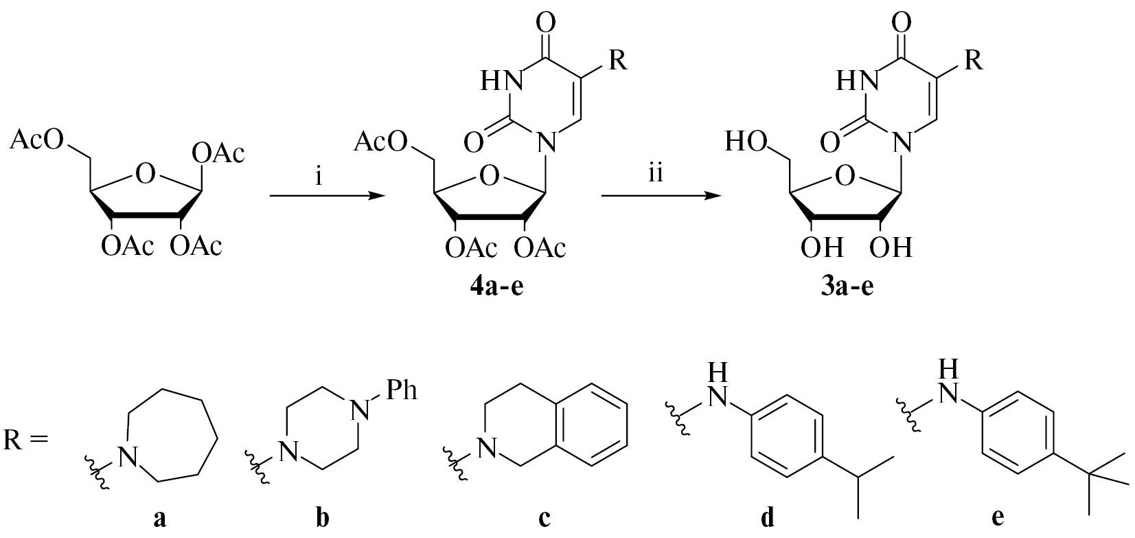 Схема 1. Условия реакций. i : 5-R-персилилированный урацил, TMCSiTfl, 1,2-дихлорэтан, ii : NH4OH/EtOH.